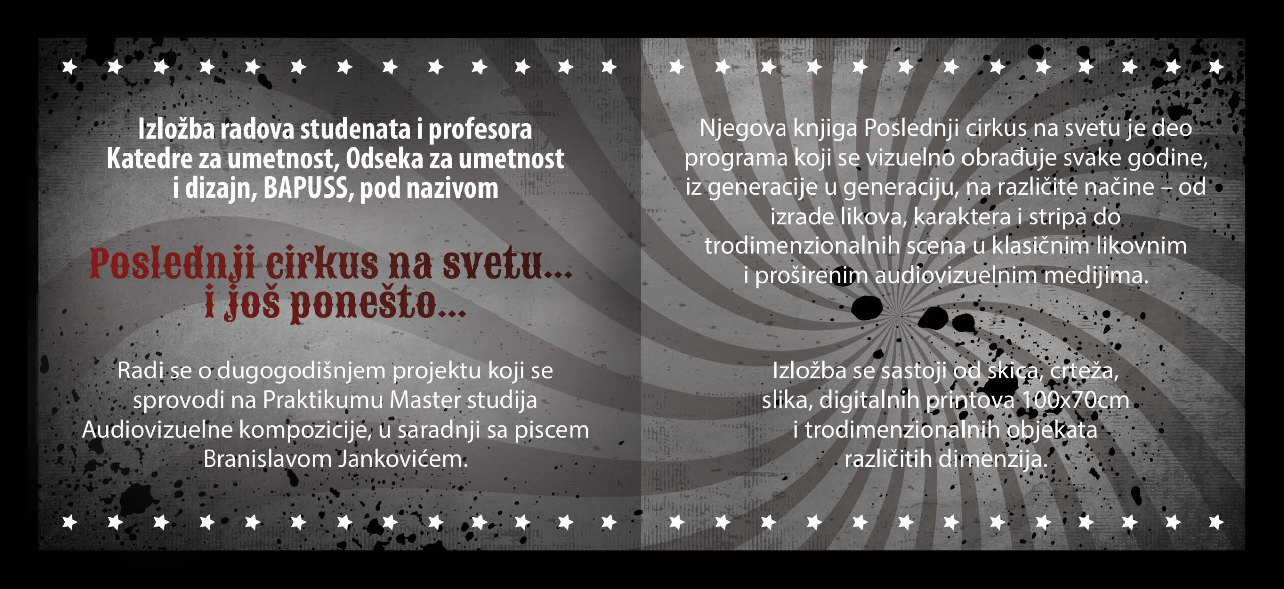 Radi se o dugogodišnjem projektu koji se sprovodi na Praktikumu Master studija Audiovizuelne kompozicije, u saradnji sa piscem Branislavom Jankovićem. Nјegova knjiga Poslednji cirkus na svetu je deo programa koji se vizuelno obrađuje svake godine, iz generacije u generaciju, na različite načine – od izrade likova, karaktera i stripa, do trodimenzionalnih scena u klasičnim likovnim i proširenim audiovizuelnim medijima. Izložba se sastoji od skica, crteža, slika, digitalnih printova, audiovizuelne produkcije i trodimenzionalnih objekata.